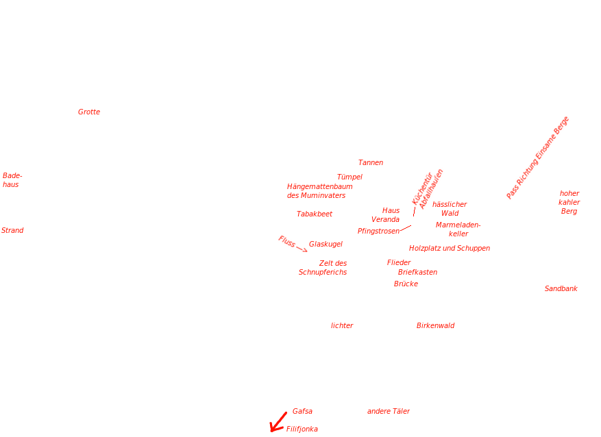 - WM: Eine wichtige und ausdrückliche Beschreibung in diesem Buch wirft große Probleme auf, da sie allen von Tove Jansson gezeichneten Karten widerspricht: Als Mumin sich nach seinem Erwachen zum ersten Mal draußen umsieht, überquert er schließlich die Brücke und wandert dann Richtung Süden; an der Grenze zu einem Nachbartal trifft er Tooticki, geht mit ihr zurück, aber nicht über die Brücke und zum Haus, sondern direkt zum Strand mit Badehaus. Daher kann das Haus eigentlich nicht wie in allen Karten dargestellt südlich des Flusses liegen, sondern muss sich nördlich davon befinden.