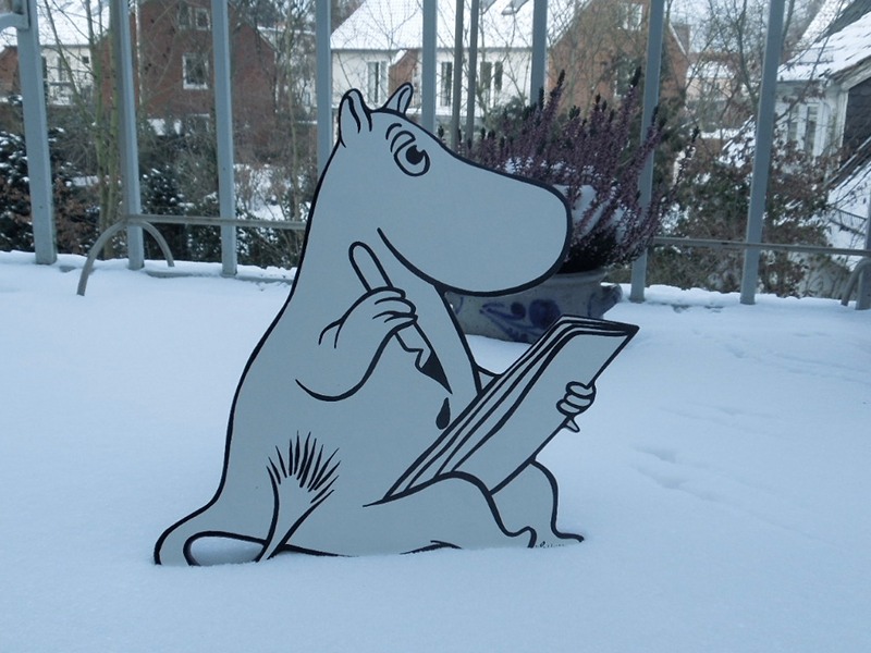 2012 habe ich einen glücklichen Sommerurlaub auf der Insel Ischia im Golf von Neapel verbracht. Es war heiß, quirlig, das volle Leben. In den vom abendlichen Gewimmel erfüllten Straßen zwischen den beiden Inselhauptstadtteilen Porto und Ponte bietet ein Comic-Kunsthandwerker hervorragend getroffene Disney-Figuren an, mit glänzendem Lack auf Holz gemalt und passgenau ausgesägt. Sein Künstlername: Il Pennello – »der Malpinsel«. Ich kam mit ihm ins Gespräch, und da ich »zufällig« ein Buch über Tove Jansson dabei hatte, in dem auch Illustrationen aus den Mumin-Büchern wiedergegeben waren, versorgte ich ihn mit einer Fotokopie und konnte mir schon wenige Tage später einen superb gelungenen Muminpapa abholen. Diesen habe ich schon mal im Schnee posieren lassen, aber erst einen Winteranbruch später schafft er es in einen Rundbrief – siehe angehängtes Bild.
