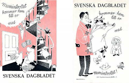 Wo ich schon von Zeitungsanzeigen schrieb, hänge ich noch eine Miniserie von zwei zueinander gehörigen Anzeigen aus den 1950ern an: »Der Mumintroll kommt zu euch nachhause – mit dem Schwedischen Tageblatt / Das Schwedische Tageblatt kommt zu euch nachhause – mit dem Mumintroll«. Auch so ein Gelegenheitswerk, aber auf jeden Fall spaßig :-)